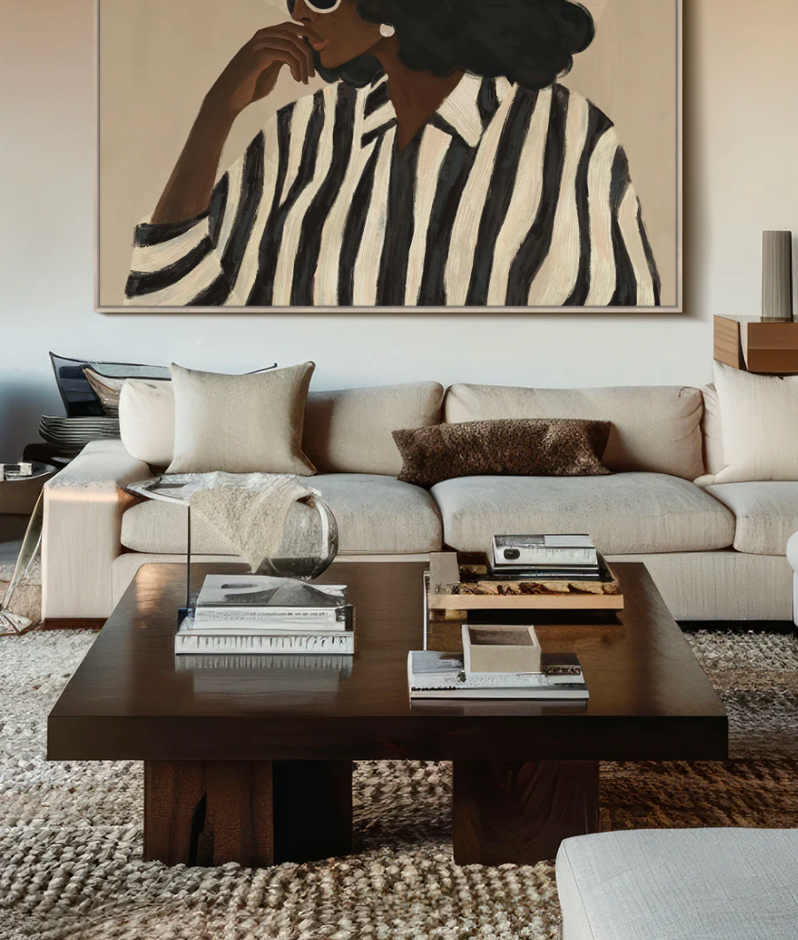 This striking Linear Poise artwork features elegant, minimalist lines that capture feminine grace with subtle sophistication. Presented on a large 80cm by 100cm canvas, it is framed in a warm oak-coloured frame and had a hand painted finish.
