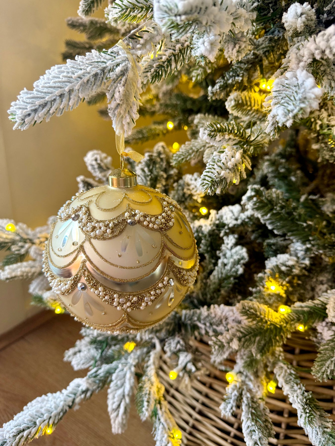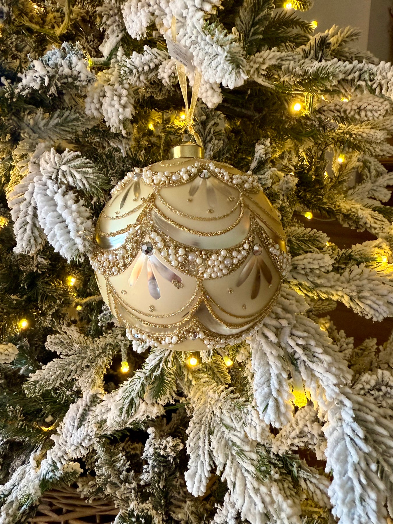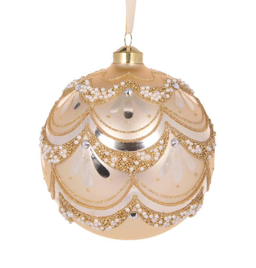 Transform your holiday decor with our Gold Scalloped Bauble Set of 2. Crafted with 10cm diameter glass baubles, each one features a stunning scalloped pattern adorned with glitter and pearls. Elevate your Christmas decorations with this elegant and festive set!