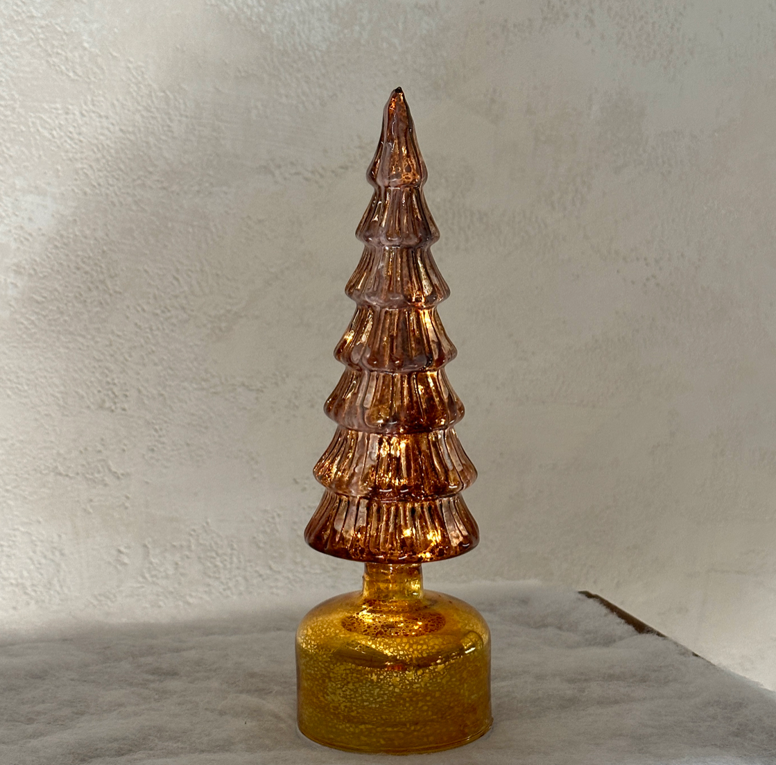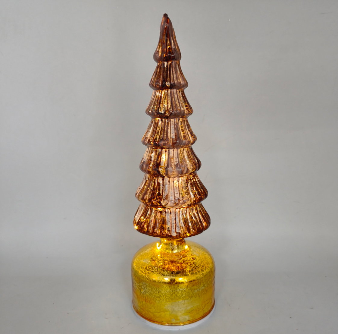 Elevate your holiday décor with this 33cm rotating Christmas tree, crafted from delicate glass in a stunning blend of copper and gold mercury finishes. Its gentle rotation adds a dynamic touch, while the elegant metallic hues bring warmth and sophistication to any space with its LED effects. Perfect as a centerpiece or accent, this glass tree creates a refined festive atmosphere that captivates with understated charm.
