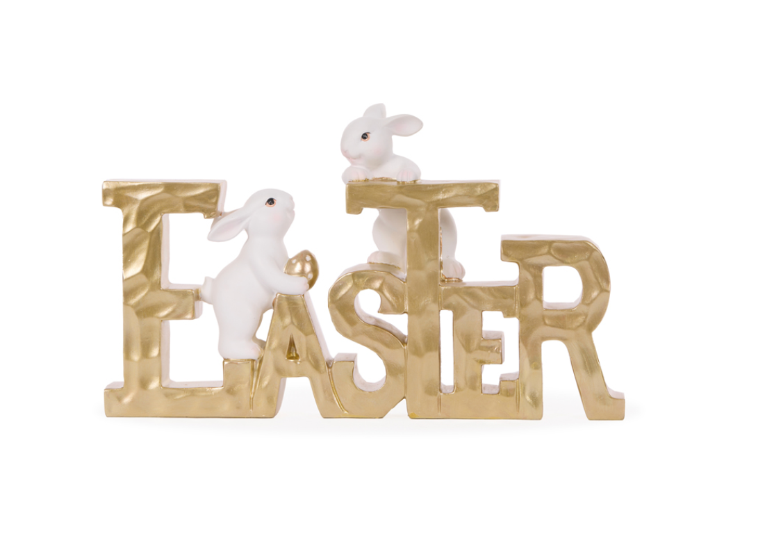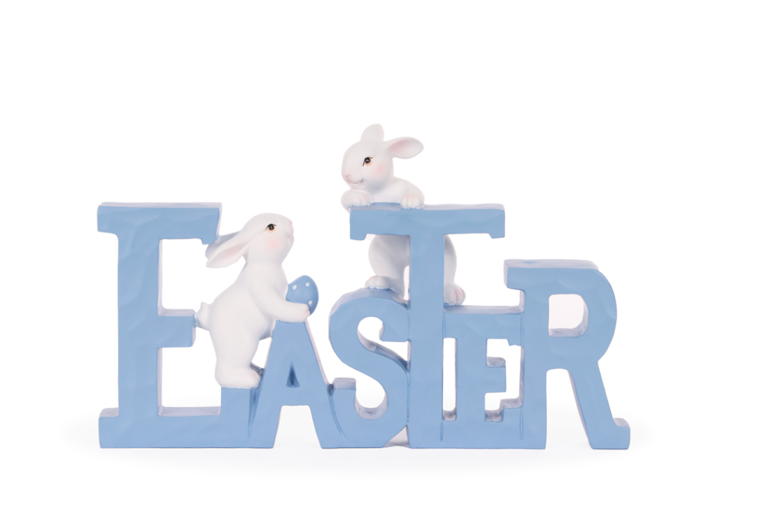 Welcome Easter with this cute Easter sign with 2 white bunnies making their entrance . The pale blue with the stark white make this sign look very sophisticated and will be impressive in your display or simply as an Easter welcome.