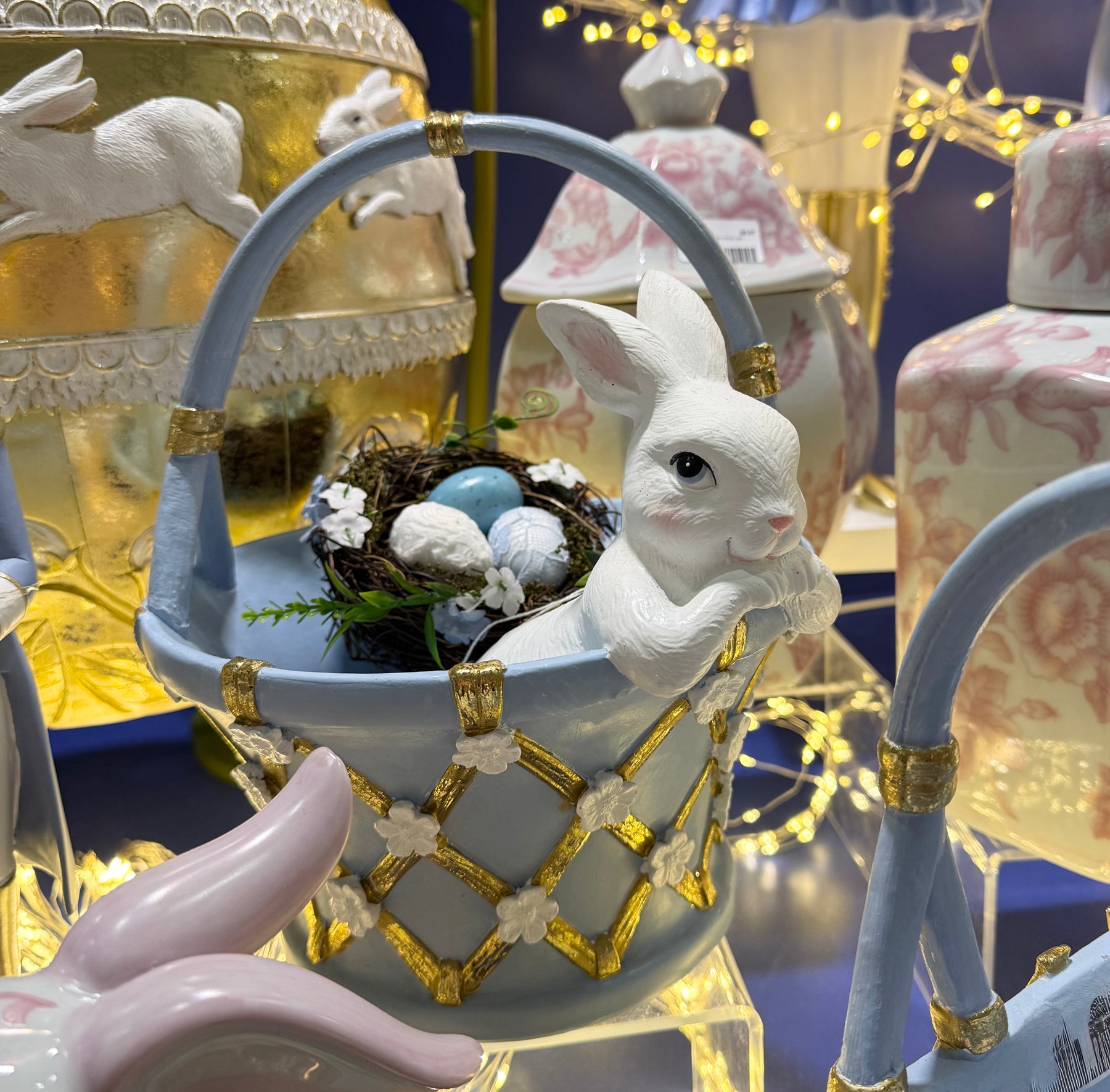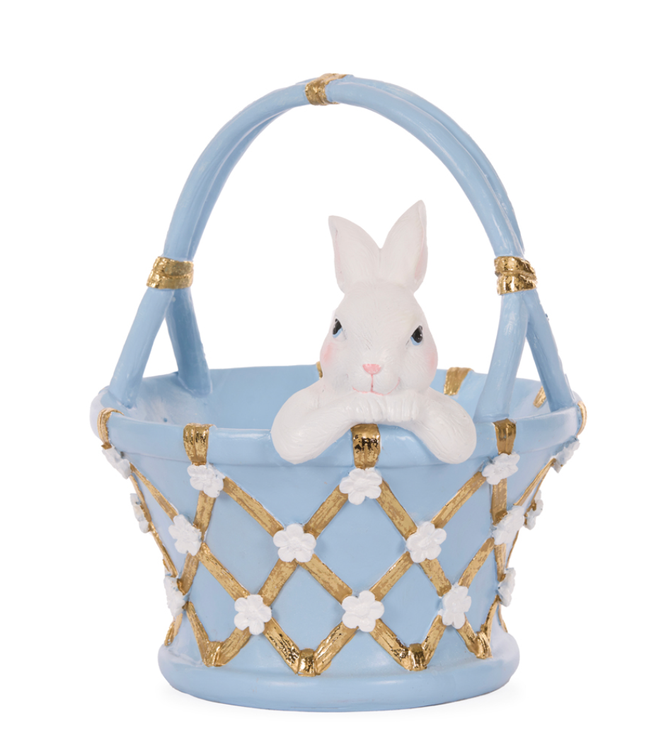 Another favourite from last year is here with us again. This delightful piece in blue with intricate detailing in gold and white. Cute white bunny hangs over the side waiting for eggs to fill this eye catching basket.