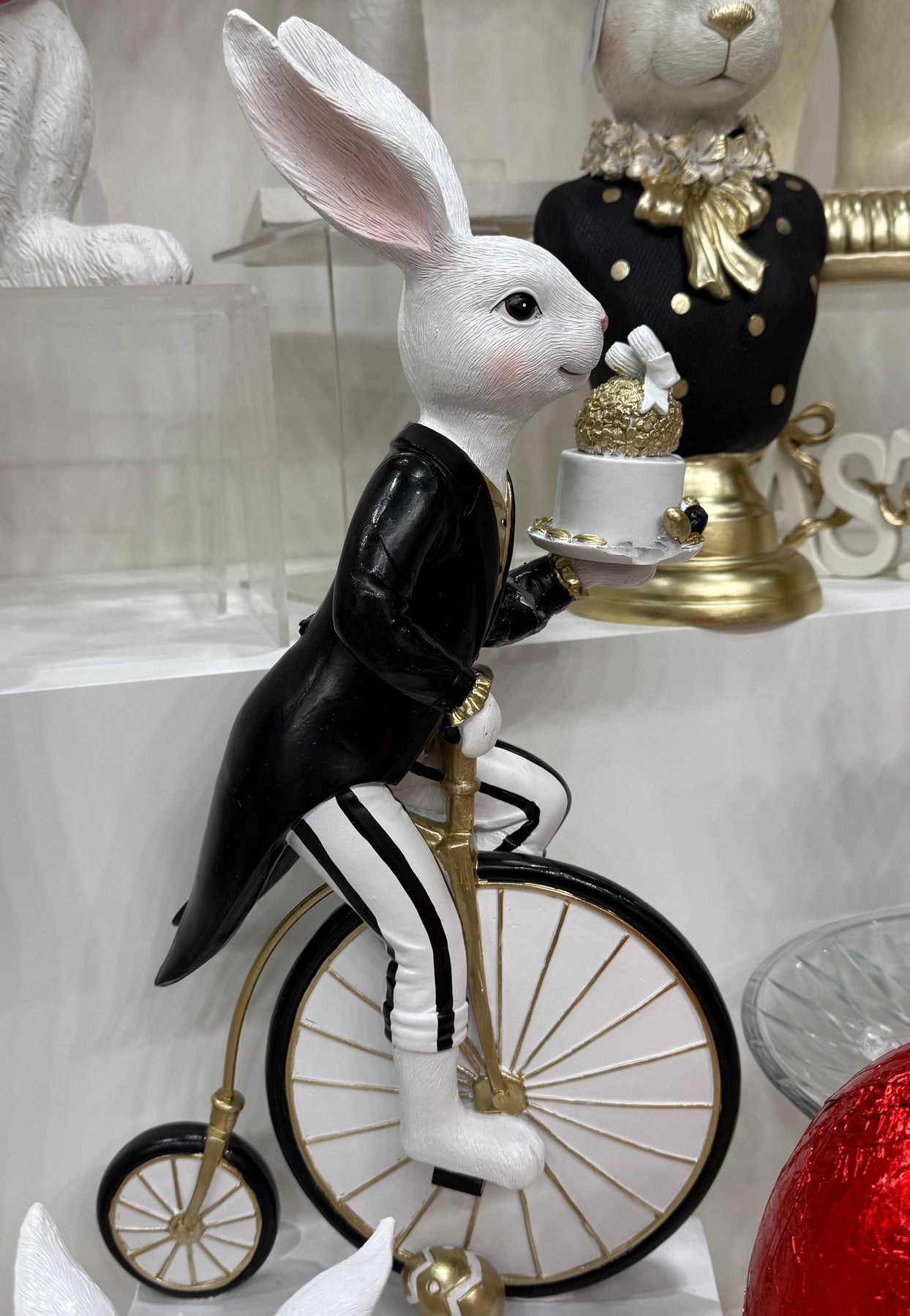 Monochrome in colour with features of gold. This ‘mad hatter’ style bunny is sure to be one of your favourites. He is large measuring 45cm in height x 23cm and made from quality resin