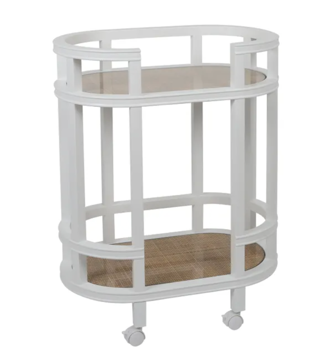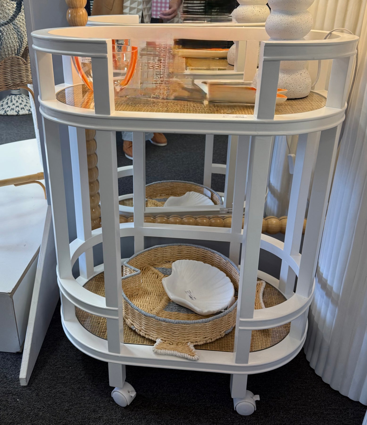 Elevate your entertaining with the Maui Rattan & Wood Bar Cart. Featuring a sleek white wooden frame and a clear glass shelf, this elegant piece combines natural rattan accents for a refined, textured look. 60cm x 36cm x 80cm on smooth-rolling wheels offers effortless mobility, making it perfect for serving drinks or displaying decor.
