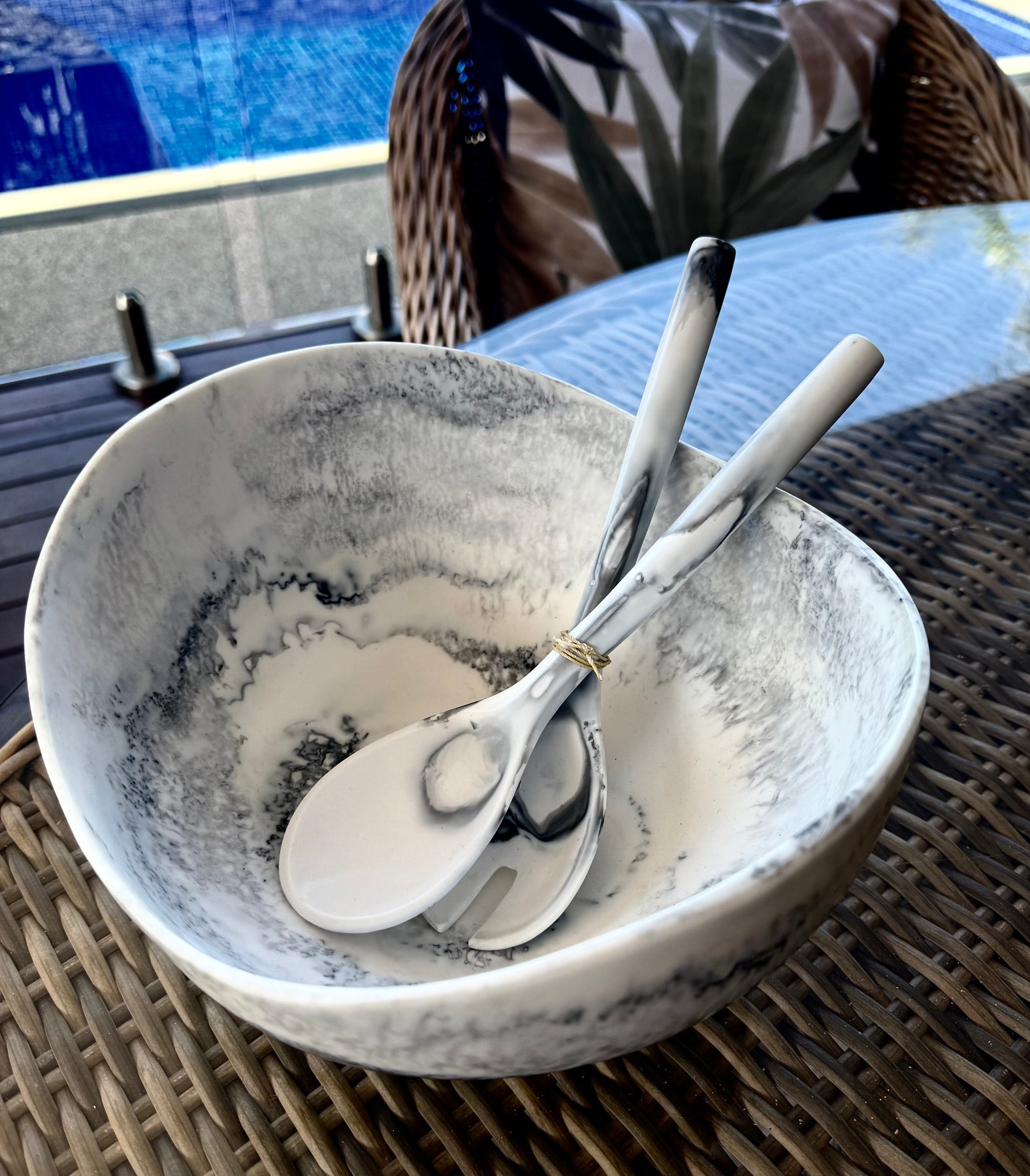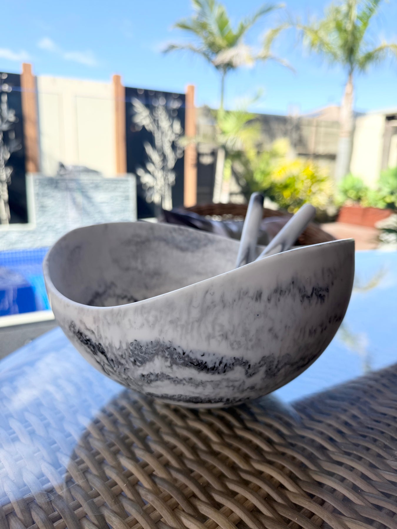 Elevate your entertaining with this stunning resin salad bowl and servers set. Crafted from durable resin, it features a mesmerizing swirl of monochrome tones that brings natural elegance to any table setting. The unusual shaped 24 x 22 x 12cm bowl pairs perfectly with 23cm servers, making it ideal for summer gatherings and alfresco dining. Whether you're hosting friends or looking for a thoughtful gift, this versatile set combines style with practicality.  It's the perfect addition to your entertaining collection.