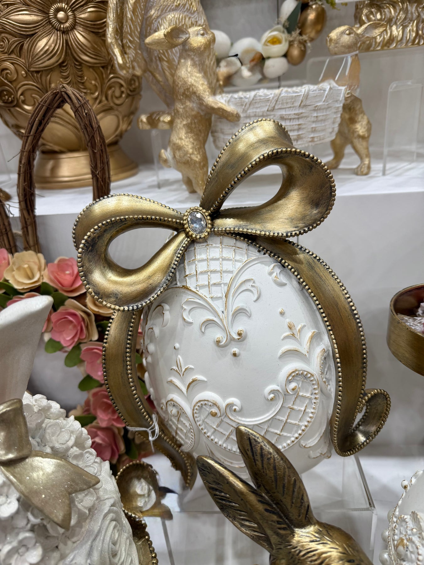 Elegant Bow Egg is sure to be the perfect addition to your lux easter look. Measuring 30cm in diameter and features a gold bow upon the resin egg. This stunning piece is sure to last years.