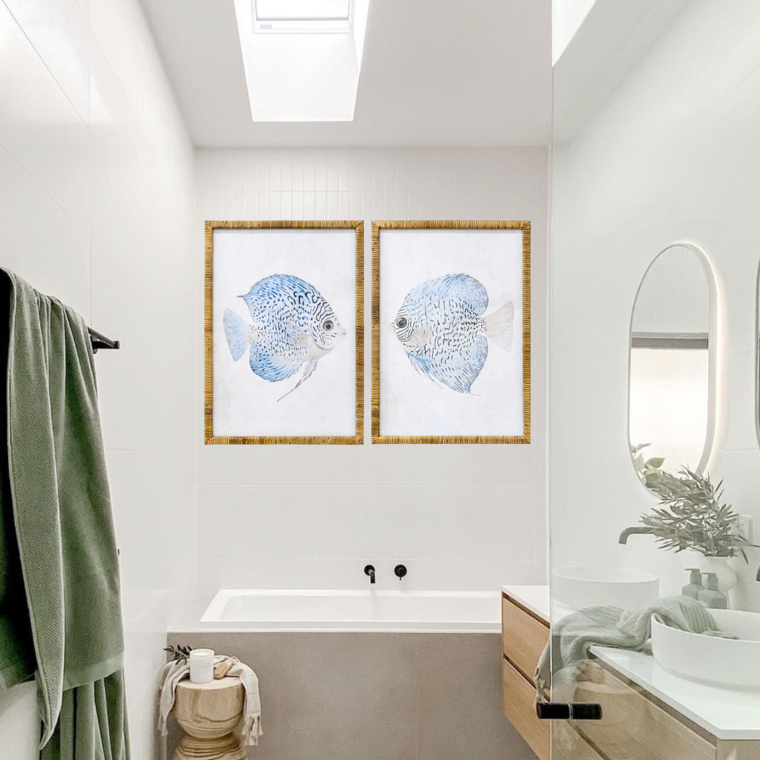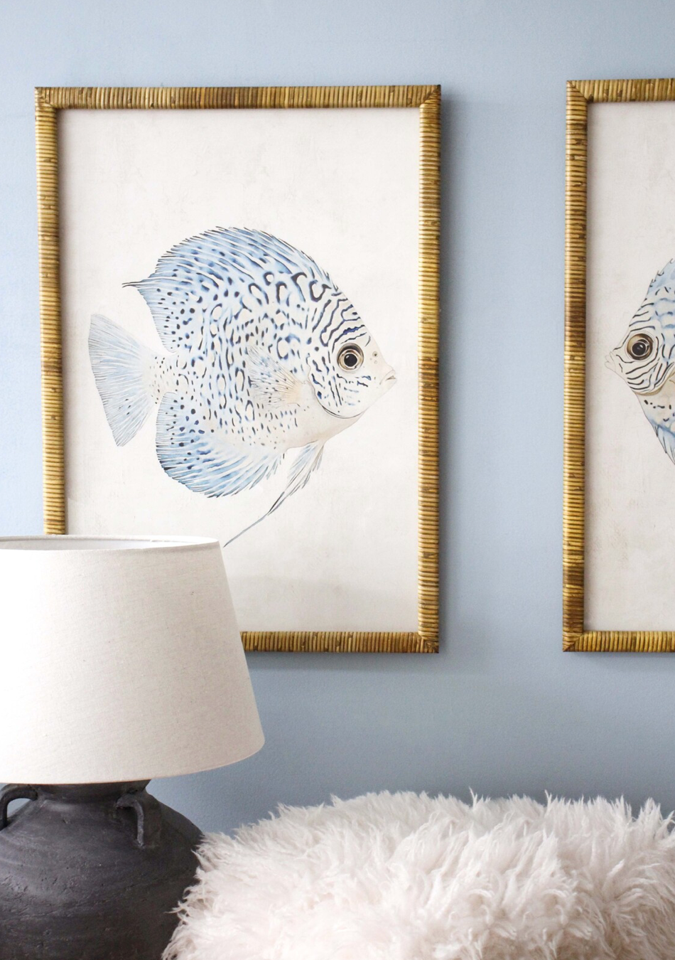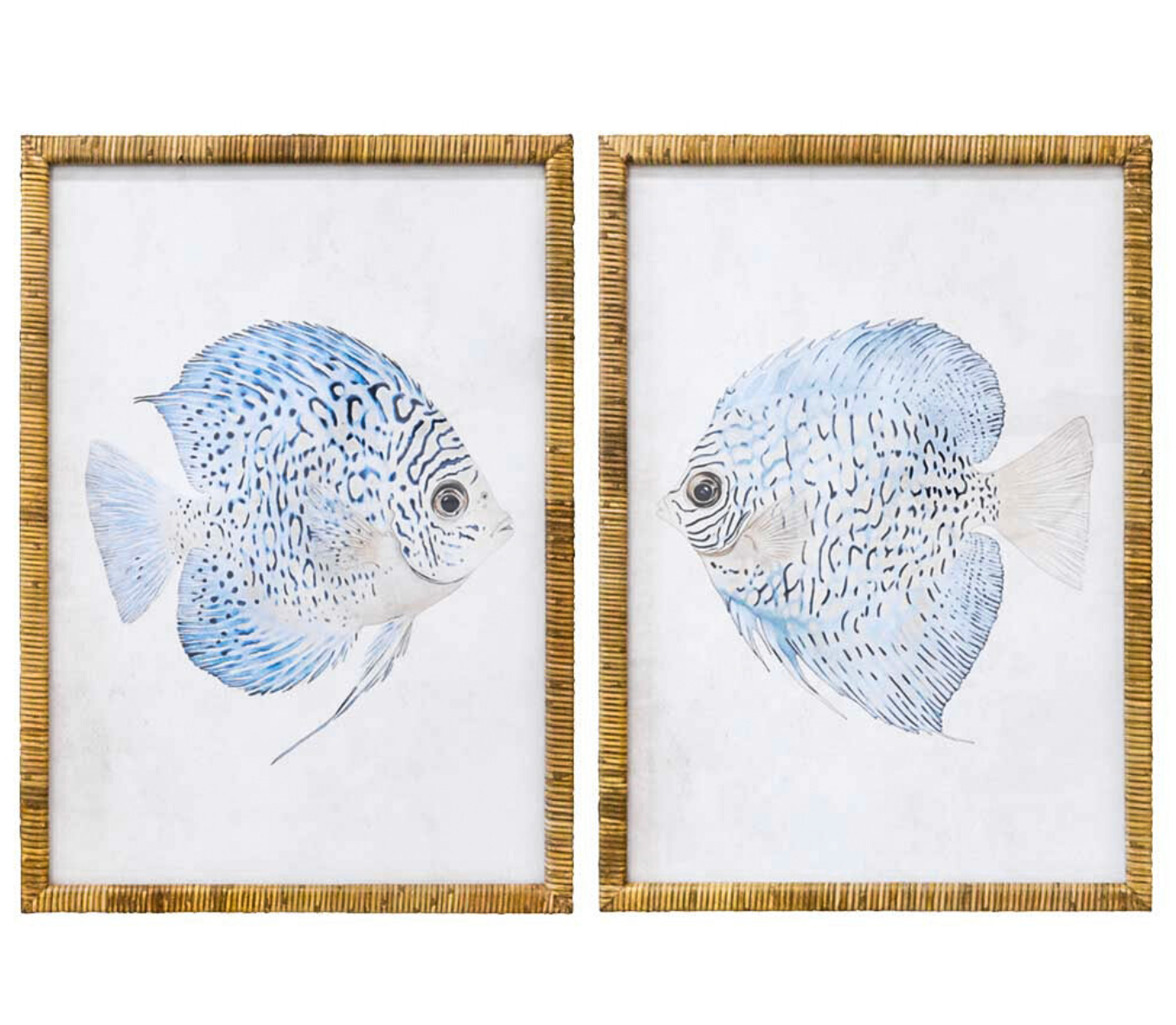 We really like these Framed Print Asstd Blue Fish - they're just so eye-catching with their cool blue and white pattern. Measuring 50x70cm, they bring a coastal vibe that's easy to style for all sorts of interiors. The fir wood frame, glass, paper, MDF, and rattan work together for a look that's pretty unique but still suits a lot of different rooms. Glass front !