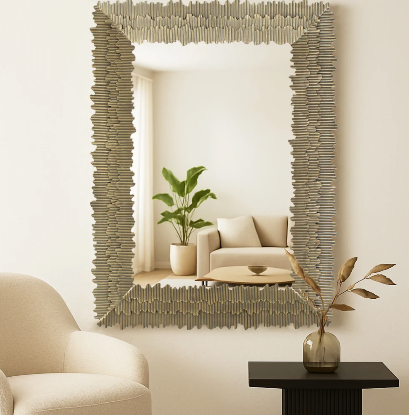 The layered detailing adds depth and dimension, while the warm metallic tones bring a refined, timeless appeal to any room. This mirror enhances light and creates a striking focal point with its understated luxury and classic contemporary style.