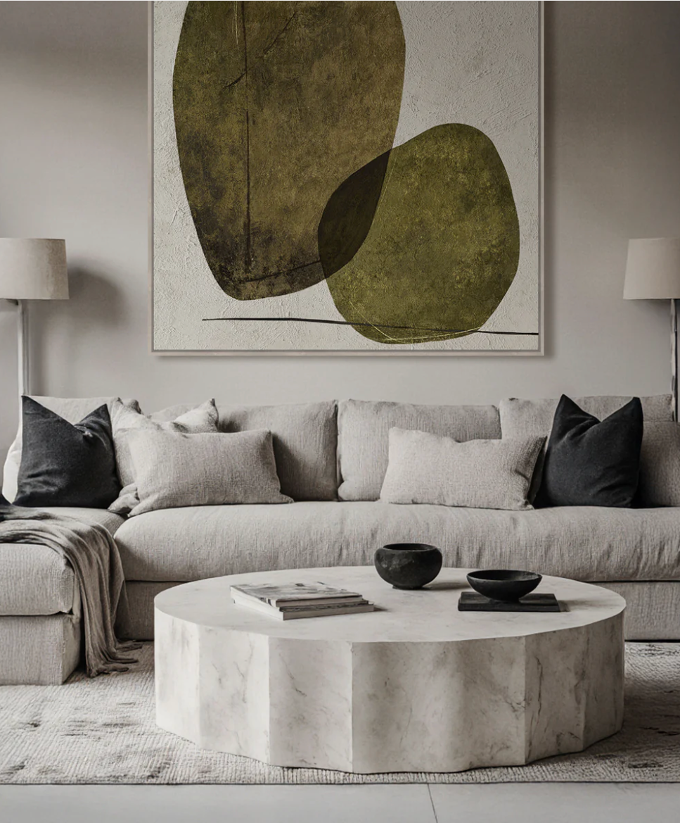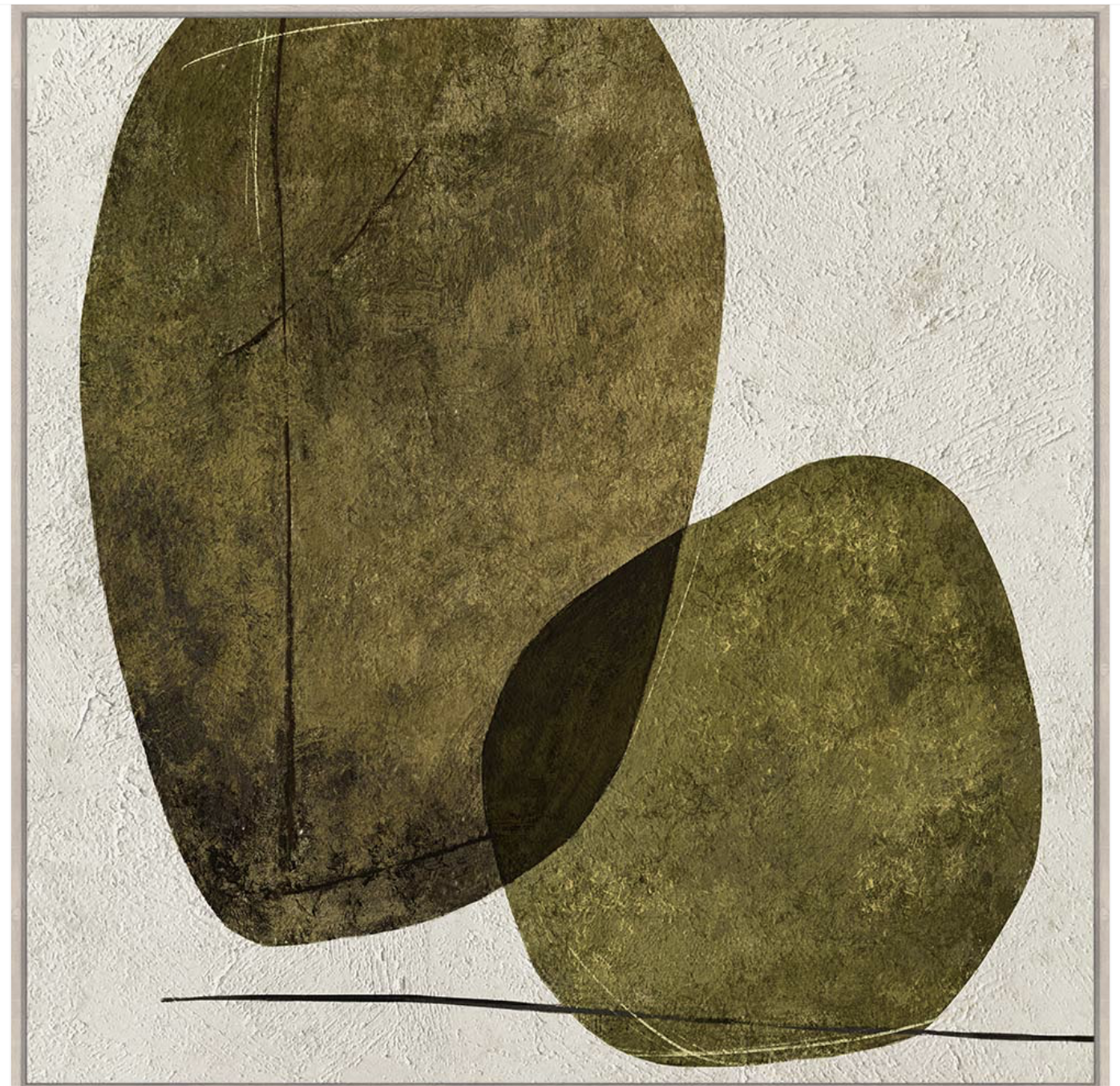 Intersecting Stones Artwork brings understated elegance to any space. This hand-painted canvas features rich olive green toning that complements modern and traditional interiors alike. Measuring 110cm x 110cm with a 4cm oak frame, it makes a confident statement in living rooms, bedrooms, or professional settings. The natural wood frame adds warmth while the carefully composed stone creates visual interest without overwhelming. Perfect for those seeking gallery-quality art that balances sophistication with versatility.