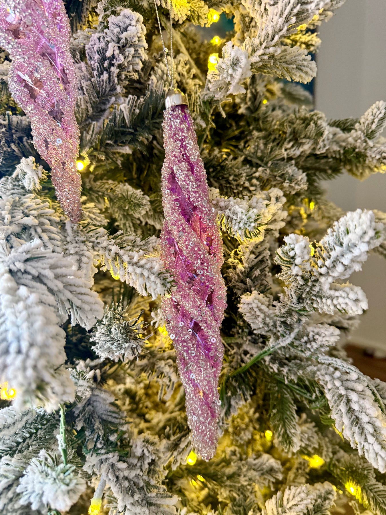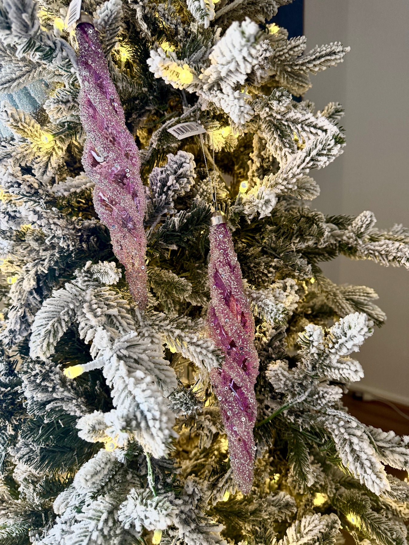 Elevate your festive décor with this exquisite pair of pink drop decorations, each measuring 26 cm in length. Featuring a graceful twisted design adorned with shimmering sequin highlights, these ornaments bring refined elegance to any Christmas tree. The sophisticated blush tone complements both traditional and contemporary holiday schemes, while the light-catching embellishments create a captivating shimmer as they catch the glow of your tree lights. Perfect for adding a touch of understated luxury to your seasonal display.